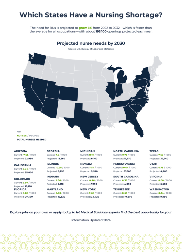 Let’s start with the big picture. The U.S. Bureau of Labor Statistics projects about 189,100 openings for registered nurses every year through 2032.